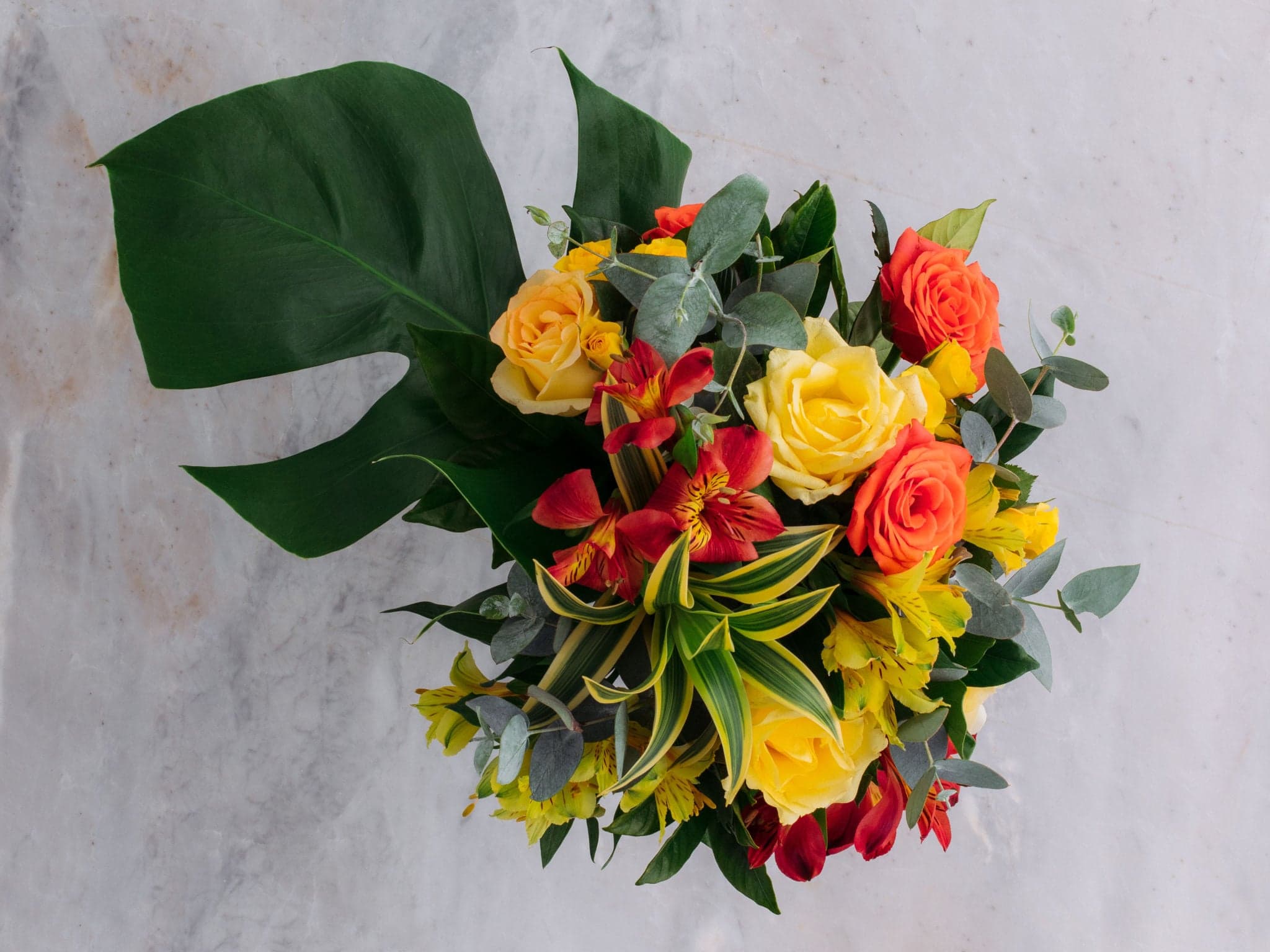 Arranjo de Rosas Amarelas e Alstroemérias Vermelhas com Folhagens