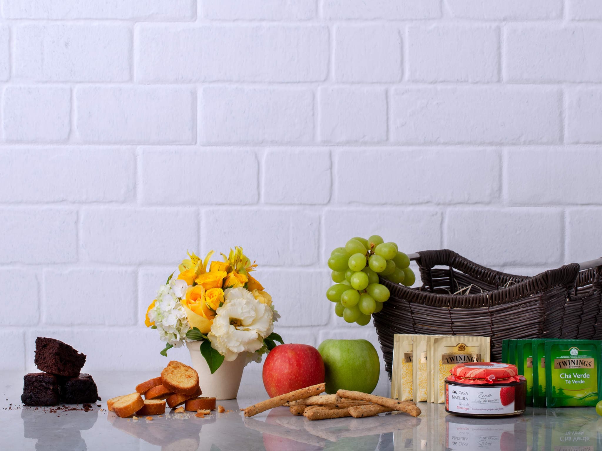 Cesta de Presente com Flores, Frutas e Guloseimas Para Entrega. Composição cuidadosamente preparada pela Petalá com flores frescas selecionadas, embalagem premium e cartão personalizado. Entrega expressa para todo o Brasil.