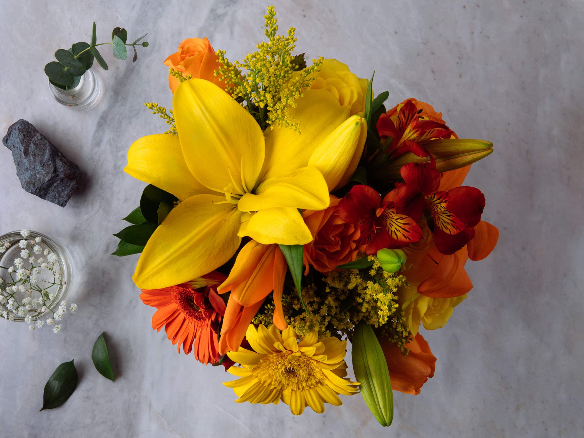 Arranjo de Flores do Campo Laranja e Amarela Para Entrega. Composição cuidadosamente preparada pela Petalá com flores frescas selecionadas, embalagem premium e cartão personalizado. Entrega expressa para todo o Brasil.