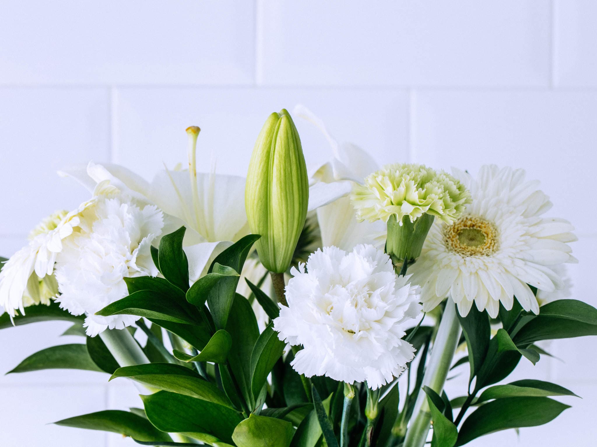 Arranjo com Rosas, Lisianthus e Alstroemérias Brancas e Verdes em Vaso