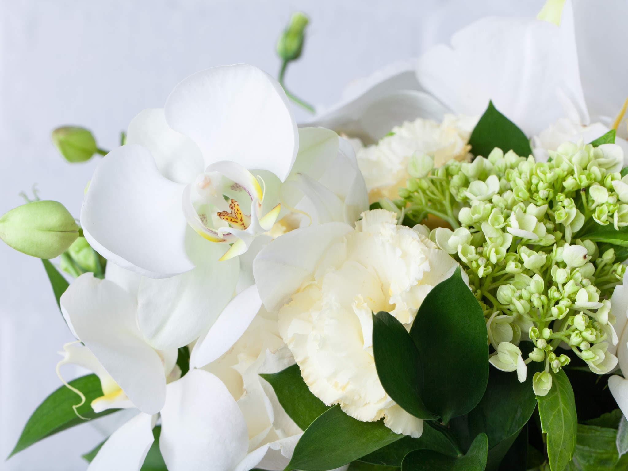 Arranjo de Rosas, Orquídeas e Hortênsias Brancas em Vaso Para Entrega
