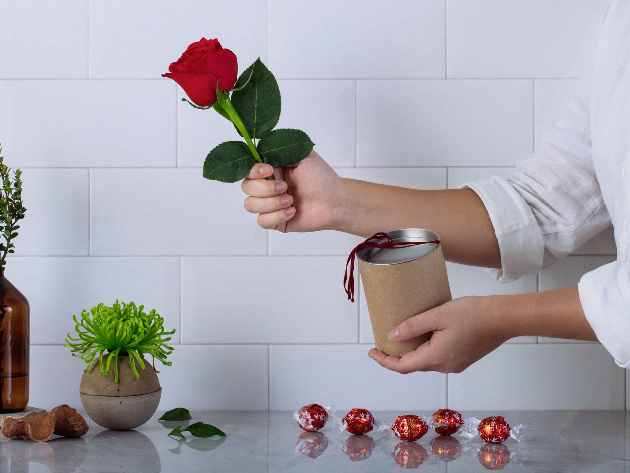 Cesta de Presente com Rosa Colombiana Vermelha e Chocolate Lindt. Composição cuidadosamente preparada pela Petalá com flores frescas selecionadas, embalagem premium e cartão personalizado. Entrega expressa para todo o Brasil.