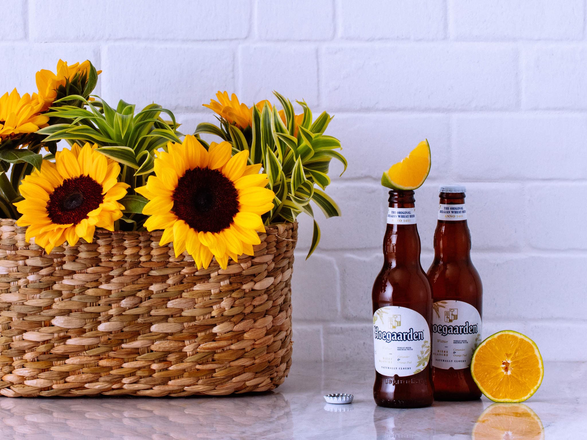 Cesta com Girassóis, Cerveja Hoegaarden Witbier e Fruta